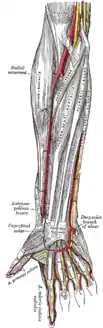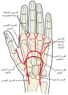 - الفرع الرسغيّ الظهريّ للشريان الكعبريّ: وعاء دمويّ صغير ينشأ تحت الأوتار الباسطة للإبهام.