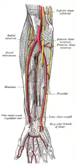 ![]() الشريان الزندي والشريان الكعبري. منظر عميق. الشريان الزندي والشريان الكعبري. منظر عميق. | |