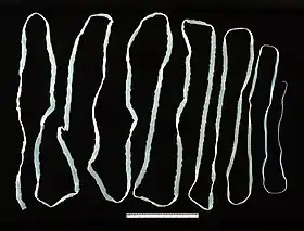 - الدودة الشريطية البقرية: (بالإنجليزية: Taenia saginata) وسميت بذلك لأن الحيوان الوسيط لها هو البقر وطول الدودة البالغة من 4 - 10 أمتار.