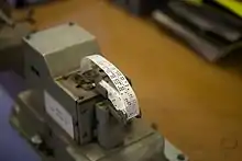 قارئ شريط ورقي على كومبيوتر من جيل مبكر مع قطعة صغيرة من شريط ذو خمسة ثقوب متصلة في دائرة - معدة لأغراض الاختبار
