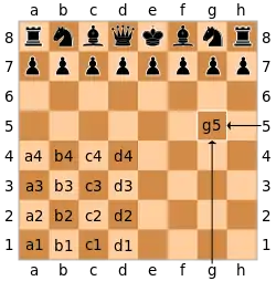 - انظر الفقرة "E. Algebraic notation" in "E.I.01B. Appendices". FIDE. مؤرشف من الأصل في 11 ديسمبر 2008. اطلع عليه بتاريخ 26 نوفمبر 2008. الوسيط