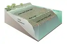 - الشعاب المرجانية - شعاب قصيرة تشبه الشعاب المرجانية، ولكنها أكثر انحدارًا ؛ تمتد للخارج وللأسفل من نقطة أو شاطئ شبه جزيرة. المرحلة الأولى من الشعاب المرجانية.