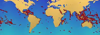 يُقدر أن الشعاب المرجانية تغطي 284300 كيلومتر مربع (109.800 ميل مربع)، أقل بقليل من 0.1 ٪ من مساحة سطح المحيطات. [11]في المحيطين الهندي والهادئ المنطقة (بما في ذلك البحر الأحمر، المحيط الهندي، جنوب شرق آسيا والمحيط الهادئ ) تمثل 91.9٪ من هذا المجموع. يمثل جنوب شرق آسيا 32.3٪ من هذا الرقم، بينما يمثل المحيط الهادئ بما في ذلك أستراليا 40.8٪.المحيط الأطلسي والبحر الكاريبي تمثل الشعاب المرجانية 7.6٪.