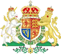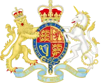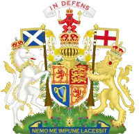 | الدرع | خوذة ذهبية عليها التاج الإمبراطوري للمملكة المتحدة وأسد عليه نفس التاج. 4 أقسام: في 1 و4: أفواه لثلاثة فهود ذهبية (وهو إنجلترا)، في 2، بالذهب، أفواه الأسد، أزهرية (وهو اسكتلندا)، في 3، الأزرق السماوي، القيثارة الذهبية، حبل الفضة (وهو أيرلندا). |