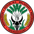 يحيط بالشعار الكلمات الملغاشية " REPOBLIKAN'I MADAGASIKARA" التي تعني "جمهورية مدغشقر" وفي القاعدة TANINDRAZANA - FAHAFAHANA - FANDROSOANA" التي تعني "الوطن - الحرية - التنمية".