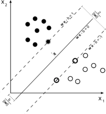 و تمثل علامة النقطة (.) الضرب القياسى للمتجهات، ويمثل ب/‖ف‖ مقدر إزاحة المستوى الفاصل عن نقطة الأصل باتجاه المتجه ف العمودى على هذا المستوى. أما مقدار الهامش فيكون 2/‖ف‖ ويهدف الخوارزم لتقليل المتجه ف بحيث تزيد قيمة هامش (حافة)الفصل.