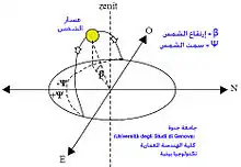 - Ψ : السمت الشمسي (الزاوية بين الإسقاط الأفقي ش^ والاتجاه شمال جنوب).
