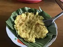 ![]() طبق أرُزّ مطحون متشرب بالزيت مُعد على الطريقة الشانيَّة، يُقدَّم على أشطار من ورق أشجار الموز مع الثوم. |