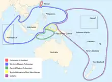 غير أن أسرة اللغة الماليزية البولنيزية استبعدت مبدئيًا منطقتي ميلانيزيا وميكرونيسيا بسبب وجود بعض الاختلافات المادية الملحوظة بين سكان هذه المناطق عن الناطقين بالملايو بولنيزية. ومع ذلك، ثمّة دليل واضح على ارتباط علاقتهم اللغوية باللغات الماليزية البولنيزية، ولا سيما في الدراسات المتعلقة باللغات الميلانيزية التي أجراها جورج فون دير غابلينتز وروبرت هنري كودرينغتون وسيدني هربرت راي. صاغ كودرينغتون مصطلح «أوقيانوسيا» اسمًا لهذه الأسرة اللغوية بدلًا من «ملايو بولنيزية» في عام 1891، وذلك بغرض استبعاد اللغتين الميلانيزية والميكرونيسية. اعتمد راي هذا المصطلح ووضّح أن الأسرة اللغوية «الأوقيانوسية» تشتمل على لغات جنوب شرق آسيا، ومدغشقر، وميكرونيسيا، وميلانيزيا، وبولنيزيا.[13][14][15]