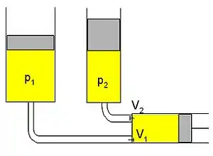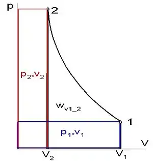 تقسيم الشغل بجزء ناتج عن تغير الحجم وجزء ناتج من عملية انزياحية يوضح لنا عمل المكبس في أسطوانة. يدفع الشغل الإزاحي الناتج من ضغط الخزان 1 بالضغط علي المكبس ، وينزاح المكبس إلى اليمين وبالتالي يتحرك ذراع المكبس إلى اليمين . ثم يقوم المكبس بالحركة إلى اليسار ويضغط الغاز بأداء شغل تغير الحجم (النقطة 2 في الرسم البياني ) و يضغط الغاز في الأسطوانة 2 بضغط أعلى مقداره .[1]