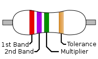 | اللون | الطوق الأول | الطوق الثاني | الطوق الثالث (عامل الضرب) | الطوق الرابع (نسبة التفاوت) | معامل الحرارة (لكل كلفن) |