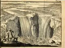 ذُكر العديد من الشخصيات على أنهم أول الوافدين الأوروبيين الذين شاهدوا شلالات نياجرا. زار الفرنسي صمويل دي شامبلان المنطقة في وقت مبكر من عام 1604 أثناء استكشافه لكندا، وأبلغه أعضاء بعثته بوجود شلالات رائعة التي وصفها في يومياته.. استكشف عالم الطبيعة الفنلندي السويدي بير كالم المنطقة في أوائل القرن الثامن عشر ويُنسب إليه أول وصف علمي للشلالات. المكرم إجماعا على الوصف الأول هو البلجيكي لويس هنبين، الذي لاحظ ووصف حالات السقوط في عام 1677، وذلك قبل كالم، بعد السفر مع المستكشف رينيه روبرت كافيلير، سيور دي لا سال لفت انظار الأوروبيين للشلالات. ومما يزيد الأمور تعقيدًا، وجود أدلة موثوقة على أن المبشر اليسوعي الفرنسي بول راغينو زار الشلالات قبل 35 عامًا من زيارة هينيبين أثناء عمله بين هورون فيرست نيشن في كندا. قد يكون جان دي بريبوف قد زار أيضًا الشلالات، بينما كان يقضي وقتًا مع الأمة المحايدة.[42]