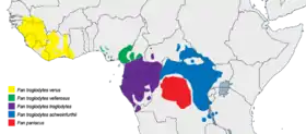 بالرغم من أن الشمبانزي لا يحسن السباحة إلا أنه يعيش في الغابات التي تنتشر فیها المسطحات المائیة في وسط وغرب القارة الأفریقیة، في دول مثل السنغال ومرورا بکونغو-کینشاسا في الضفة الشمالیة لنهر کونغو، وکذلك موجود في تانزانیا وأوغندا ویعیش الشمبانزي في غابات مفتوحة ذات الأشجار الضخمة والتي یکثر فیها سقوط الأمطار. وکذلك یمکن أن یتواجد الشمبانزي في المناطق الجبلیة الملیئة بالأشجار أو بالأعشاب. ومن أوراق هذه الأشجار يبنى الشمبانزي لنفسه أماكن للنوم.