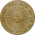 الشمس وتسمى الشمس مايو، هو نسخة طبق الأصل من النقش على أول عملة الأرجنتينية، وافق في عام 1813 من قبل الجمعية التأسيسية، التي كان ثمانية قيمة إيسكودو (دولار واحد الإسباني).