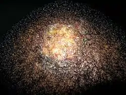 تبدأ ببقع محمرة على فروة الرأس وعليها بثرات، حيث تجتمع مع بعضها لتشكل قرصاً ملتهباً يرتفع قلبلاً عن سطح الرأس قطره عدة سنتمترات، وتزول الأشعار عن الشهدة[1] وتنزُ قيحاً، تتضخم العقد اللمفية المجاورة، يستمر وجود الشهدة لفترة من الزمن ثم تتراجع وتترك ندبة في مكانها.