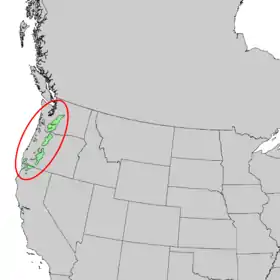موطنه معظم مناطق شمال غرب الولايات المتحدة من شمال كاليفورنيا إلى واشنطن.