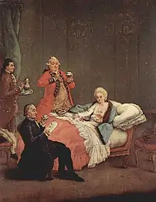 للرسام الفرنسي فيليب دوفور سنة 1685، تظهر أقصى اليمين شخصاً من حضارات أمريكا الجنوبية يشرب الشوكولاتة.