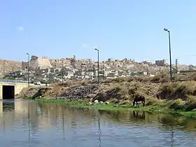 ![]() جزء من بلدة شيزر وتظهر خلفها قلعتها الآثرية | |
