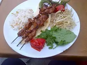 ![]() "شيش كباب" مع بصل، فلفل مشوي، شريحة من الطماطم وأوراق جرجير | |