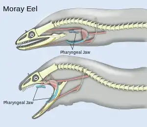 كما يوجد لديها فم واسع وفك قوي ومسلح بأسنانٍ هائلة وحادة بشكلٍ عام والتي تمكن سمك الموراي ليس فقط الاستيلاء على فريستها (التي تتكون أساسًا من أسماكٍ أخرى) ولكن أيضًا إلحاق جروح بالغة، وخطيرة في بعض الأحيان، على أعدائها. فهي تهاجم الأشخاص الذين يقتربون من أماكن الإخفاء الخاصة بها في المياه الضحلة حيث يتم إخافتها من قِبَل الصيادين. على الأقل نوع واحد من الموراي الشبكي تمتلك فك بلعومي إضافي داخل البلعوم، والذي يكون قابلًا للتحرك ويمكنه التقدم بسرعةٍ للأمام للمساعدة في القبض على الفريسة.[7]
