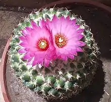 نبات كروي الشكل وقد يستطيل احيانا بطول العمر مغطي بأشواك كثيرة قوية الأزهار حمراء أو صفراء تخرج في قمة النبات سريعة الذبول، ويتكاثر بالبذور، عادة معمر لسنوات طويلة مع العناية به. ويعتبر من أجمل نباتات التنسيق الداخلي والحدائق الصخرية والمعارض.