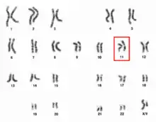 ![]() زوج الصبغي 11 لرجل كما تظهر بواسطة الكاريوغرام. | |