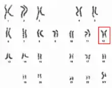 ![]() زوج الصبغي 12 لرجل كما تظهر بواسطة الكاريوغرام. | |