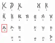 ![]() زوج الصبغي 13 لرجل كما تظهر بواسطة الكاريوغرام. | |