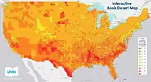 قامت مؤسسة اتحاد محو الأمية بتطوير خريطة صحراوية لكتاب الولايات المتحدة تدعمها برنامج نظم المعلومات الجغرافية الخاصة بـمعهد بحوث النظم البيئية، والتي تقدم عرضًا مرئيًا لنقص الكتب في الدولة والولايات والمقاطعات ومسارات التعداد،[10] لإنشاء الخريطة، أجرت مؤسسة اتحاد محو الأمية تحليلات إحصائية للبيانات من التقييم الوطني للتقدم التعليمي ومسح المجتمع الأمريكي، تشمل البيانات المستخدمة في الخريطة عدد الكتب في منازل طلاب الصف الرابع ومتوسط دخل المجتمع والتنوع العرقي والموقع الجغرافي ولغة المنزل. كشفت "مؤسسة اتحاد محو الأمية" عن الخريطة خلال اجتماع مبادرة كلينتون العالمية الأمريكية الذي عقد في دنفر، كولورادو، في يونيو 2014.