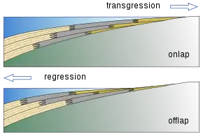 إن الحالة التي تتحرك فيها السواحل في اتجاه القارة تسمى تقدم البحر وفي تلك الحالة توضع أعماق البحار البحرية على واجهات ضحلة وهي سلسلة تسمى أونلاب. التراجع هو الوضع الذي يتحرك فيه خط ساحلي في اتجاه البحر مع التراجع تظهر الوجوه الضحلة على أعلى من الوجوه العميقة وهو وضع يسمى أوفلاب.[48]