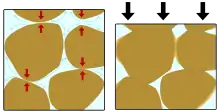 عندما يستمر الترسيب تصبح طبقة الصخور القديمة دفن أعمق نتيجة لذلك ويزداد الضغط الصخري في الصخور بسبب وزن الرواسب المغمورة. هذا يسبب الضغط وهي عملية فيها الحبوب ميكانيكيا إعادة تنظيم. فالضغط، على سبيل المثال عملية دياجينية هامة في الطين والتي يمكن أن تتكون في البداية من 60٪ من الماء أثناء الضغط ويتم الضغط على هذا الماء الخلالي من المسام المساحات. ويمكن أيضا أن يكون الضغط نتيجة حل الحبوب عن طريق حل الضغط وتترسب المواد المذابة مرة أخرى في المسام المفتوحة المساحات مما يعني أن هناك تدفق صافي المواد في المسام. ومع ذلك، في بعض الحالات، يذوب المعدنية معينة ولا يعجل مرة أخرى هذه العملية وسميت الرشح ويزيد من مسام الفضاء في الصخور.