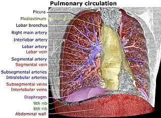 تقديم عرض تصوير مقطعي عالي الدقة للصدر. تم إزالة الجدار الصدري الأمامي والممرات الهوائية والأوعية الرئوية الأمامية لجذر الرئة رقميًا لتصور المستويات المختلفة للدورة الرئوية.