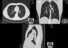 ![]() صورة بالأشعة السينية للصدر توضح التشريح الداخلي للقفص الصدري، الرئتين و القلب، وكذلك الحدود الصدرية السفلية المكونة من الحجاب الحاجز. | |