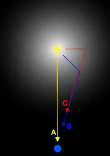 في الرسم التوضيحي الأول أعلاه، ينبعث الضوء التالي لمسار A من المصدر الأصلي ويصل إلى المراقب أولاً. ينعكس الضوء الذي يتبع المسار B على جزء من سحابة الغاز عند نقطة ما بين المصدر والمراقب، وينعكس الضوء التالي لمسير C على جزء من سحابة الغاز عموديًا على المسار المباشر. على الرغم من أن الضوء الذي يتبع المسارين B و C يبدو أنهما يأتيان من نفس النقطة في السماء إلى الراصد، فإن B هي في الواقع أقرب إلى حد كبير. ونتيجة لذلك، يظهر الصدى للمراقب للتوسع بمعدل أسرع من سرعة الضوء.