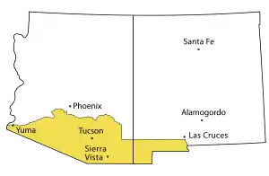 |CitationClass=تم تجاهله (مساعدة) The Purchase treaty defines the new border as "up the middle of that river (the ريو غراندي) to the point where the parallel of 31° 47' north latitude crosses the same 31°47′0″N 106°31′41.5″W; thence due west one hundred miles; thence south to the rallel of 31° 20' north latitude; thence along the said parallel of 31° 20' to the 111th meridian of longitude west of Greenwich 31°20′N 111°0′W; thence in a straight line to a point on the Colorado River twenty English miles below the junction of the Gila and Colorado rivers; thence up the middle of the said Colorado river until it intersects the present line between the United States and Mexico." The new border included a few miles of the نهر كولورادو at the western end; the remaining land portion consisted of line segments between points, including 32.49399°N 114.813043°W at the Colorado River, west of Nogales at 31.33214°N 111.07423°W, near AZ-NM-Mexico tripoint at 31.332099°N 109.05047°W, the eastern corners of NM southern boot heel (Hidalgo County) at 31.78378°N 108.20854°W, and the west bank of the ريو غراندي river at 31.78377°N 106.52864°W