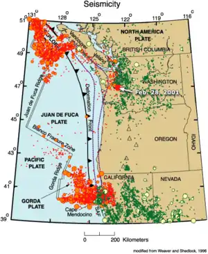إن آخر زلزال كبير الدسر في منطقة اندساس كاسكاديا كان زلزال كاسكاديا 1700، الذي كانت درجته بمقياس العزم الزلزالي تقدر من 8.7 إلى 9.2. واعتمادًا على التأريخ بالكربون المشع لرواسب تسونامي المحلية، فقد وقع حوالي عام 1700. وكما ذُكر في مجلة ناشيونال جيوغرافيك يوم 8 ديسمبر 2003، فإن السجلات اليابانية تشير أن الزلزال قد سبب تسونامي في اليابان الذي وقع مساء يوم الثلاثاء الموافق 26 يناير 1700.