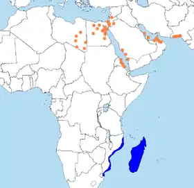 ![]() Global range. Orange dots: Breeding colonies Blue: Wintering range | |