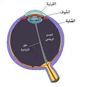 1. الخلط الزجاجي 2. الحاشية المشرشرة 3. العضلة الهدبية 4. النطيفة الهدبية 5. قناة شليم 6. الحدقة 7. الغرفة الأمامية 8. القرنية 9. القزحية 10. قشرة العدسة 11. العدسة 12. النواتئ الهدبية 13. الملتحمة 14. العضلة المائلة السفلية 15. العضلة المستقيمة السفلية 16. العضلة المستقيمة الوسطى 17. أوردة وشرايين الشبكية 18. القرص البصري 19. الأم الجافية 20. شريان الشبكية المركزي 21. الوريد الشبكي المركزي 22. العصب البصري 23. الأوردة الدوارية 24. غمد المقلة 25. بقعة الشبكية 26. النقرة المركزية 27. بياض العين 28. المشيمية 29. العضلة المستقيمة العلوية 30. الشبكية