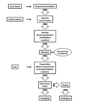 بالمقارنة مع إنتاج صلصة الصويا ، يتم الحصول على صلصة الذرة عن طريق التخمير. تستخدم عملية التخمير أنواع بكتيريا الوتديات. [3] يتم التحكم في معاملات التخمير للوقت ودرجة الحرارة ودرجة الحموضة. بعد التخمير يخضع المرق لخطوة طهي لقتل الكائنات الحية الدقيقة المخمرة ولإحداث تفاعل ميلارد محكوم. تتم إزالة كتلة الخلية عن طريق الترشيح. يتم تركيز المرق المفلتر للحصول على عجينة ولإنتاج المزيد من منتجات ميلارد. أثناء التبخر، يضاف الملح لتحسين الاستقرار الميكروبي. بالنسبة للمنتج كمسحوق، فانه يتم تطبيق خطوة التجفيف.