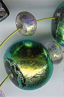 الخرزات الزجاجية المزدوجة اللون تسخدم بصورة متزايدة لانتاج خرز فنية راقية .يملك الزجاج المزدوج اللون طبقة معدنية رقيقة منصهرة على سطح الزجاج، مما ينتج عنه ان السطح يملك بريق معدني يتغير بين لونين عندما يشاهد من زاويتين مختلفتين .الخرز يمكن ان تكبس أو تصنع بتقنيات (اعمال الشعلة) التقليدية .إذا ما الزجاج بقى في اللهب لفترة طويلة يتحول إلى اللون الفضي ويحترق.