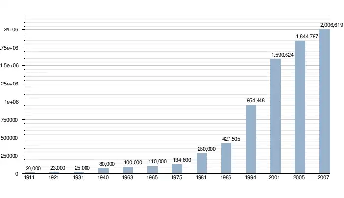 | 1963 | 100,000 | 1965 | 110,000 | 1975 | 134,600[54] | 1981 | 280,000 |