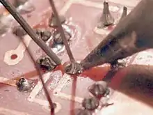 اللحام بالقصدير هي عملية توصيل تنجز عند درجة حرارة تحت 450 درجة مئوية. وهي عملية تشبه التنحيس بأن معدن الملء ينصهر ويسيل في المجاري الشعرية التي تشكلها الوصلة، ولكن عند درجة حرارة أخفض. وبسبب درجة الحرارة المنخفضة والسبائك المختلفة المستخدمة كمعدن للملء، فإن التفاعل البنيوي بين معدن الملء والمشغولة يكون صغيرًا مؤديًا إلى وصلة أضعف.