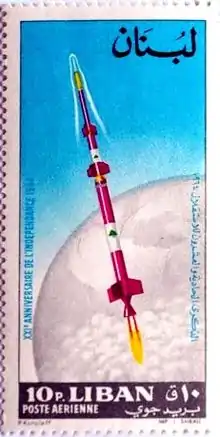 ![]() طابع لبناني صدر عام 1964 في الذكرى 21 لاستقلال لبنان ويظهر فيه أحد صواريخ أرز | |