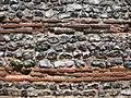 لقطة مقرّبة لجدار حصن الشاطئ الروماني في قلعة بورغ في نورفولك حيث تُظهر مسارات متناوبة من الصوان والطوب الروماني
