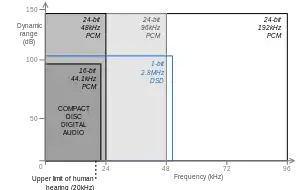 الصوت عالي الدقة ( صوت عالي الدقة) هو مصطلح فني وتسويقي للصوت بأكثر من معدل عينة 4 4,100 Hz أو أعلى من عمق البت الصوتي 16 بت. يشير عادة إلى 96 أو 192 معدلات عينة كيلوهرتز.
