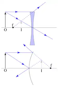 في الأعلى: كيفية تكون الصورة الوهمية في العدسة المقعرة، في الأسفل: كيفية تكون الصورة في مرآة محدبة. الرموز: f هي البؤرة، وI هي الصورة، وO هو الجسم