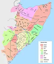 ينحدر الصوماليون إثنيًا من أصل كوشيّ، لكن لديهم أعراف موروثة تنحدر من مختلف الأولياء المرتبطين بانتشار الإسلام.[15] يشكلون قبيلة واحدة تنقسم إلى مجموعات عشائرية مختلفة، وهي وحدات القرابة المهمة التي تلعب دورًا محوريًا في الثقافة والسياسة الصومالية. فالأسر العشائرية أبوبيّة بطبيعتها أي تُنسب إلى الأب، وتنقسم بدورها إلى عشائر أو أنساب أولية أو عشائر فرعية، بالإضافة لمجموعات القرابة التي تدفع الديّة. تُستخدم مصطلحات النسب ( قبيل، كولو، جيليب، رير) غالبًا على سبيل الترادف للإشارة إلى مستويات التقسيم المختلفة. تمثل العشيرة أعلى مستوى من القرابة، فهي تمتلك ممتلكات إقليمية ويرأسها عادة زعيم العشيرة أو السلطان. تنحدر الأنساب الأولية مباشرةً من العشيرة، وهي وحدات تتبع سياسية الزواج من خارج القبيلة مع عدم وجود زعيم رسمي لها، وتمثل مستوى التقسيم الذي يشير الفرد عادةً بانتمائه له، إذ يُنسب المرء للوليّ المؤسس من ستة لعشرة أجيال.[16]