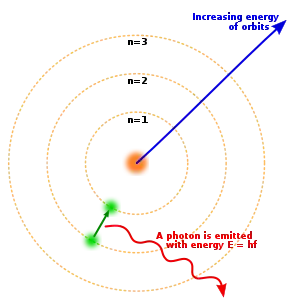 في عام 1913، قام نيلز بور بحساب طيف ذرة الهيدروجين بمساعدة نموذج بور للذرة وفيه يكون الإلكترون يحوم حول بروتون ضمن مجموعة منفصلة ومحددة من المدارات (مفهوم المدار كان كلاسيكيا في هذا النموذج)، كان تحديد المدارات المسموح للإلكترون بالدوران فيها يحدد في نموذج بور بأن يكون الزخم الزاوي مضاعف صحيح لثابت بلانك.يمكن للالكترونات أيضا أن تقوم بقفزات كمومية quantum leap من مدار لآخر، باعثا أو ممتصا كما من الطاقة بشكل ضوء يوافق التردد (التواتر) المناسب.