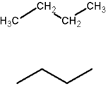 لاحظ أن يعبر الشكل الخطي للمركبات العضوية في المعادلة البنائية أن يكون هناك ذرات كربون في أخر الخط (السلسلة). وكل ذرة كربون بدورها يفترض أنها مرتبطة بعدد ذرات الهيدروجين الكافية ليصبح لكل ذرة كربون أربع روابط. وموضح بالشكلين كل من المعادلة البنائية كاملة ومختصرة.
