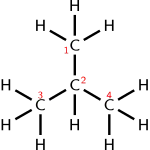 يمكن التعبير عن الجزيئات ذات المجموعات الوظيفية المتعددة التي هي نفسها من خلال إحاطة المجموعة المكررة بين قوسين دائريين . على سبيل المثال، يمكن كتابة الأيزوبيوتان (CH 3 ) 3 CH. تشير هذه الصيغة البنائية المكثفة إلى اتصال مختلف عن الجزيئات الأخرى التي يمكن تشكيلها باستخدام نفس الذرات بنفس النسب (أيزومرات). تشير الصيغة (CH 3 ) 3 CH إلى ذرة كربون مركزية متصلة بذرة هيدروجين واحدة وثلاث مجموعات CH 3 . يمكن استخدام نفس عدد ذرات كل عنصر (10 هيدروجين و 4 ذرات كربون، أو C 4 H 10 ) لصنع جزيء سلسلة مستقيمة، n - بيوتان : CH 3 CH 2 CH 2 CH 3 .